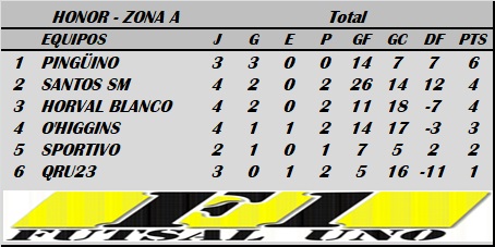 El domingo continuaron los partidos de la zona A. Por la cuarta fecha se registraron dos goleadas, primero, Santos SM goleó 11-2 a Qru 23 y O’Higgins a Horval Blanco 9-4. Finalizados los partidos del fin de semana las posiciones en Honor en la “Zona A” quedaron de la siguiente manera.