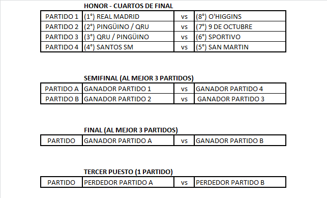 La semana pasada se jugó la última fecha (fecha 11), pero quedó un partido pendiente de la décima que se completará esta tarde en las instalaciones de la Casa del Deporte entre Qru y 9 de Octubre. Una vez jugado este partido se sabrá quien es el rival de Sportivo y 9 de Octubre en cuartos de final. Hasta el momento los cruces de Play Off confirmados son dos. Real Madrid vs O’Higgins y Santos vs San Martín.