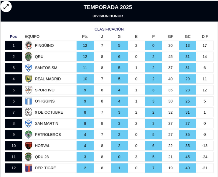 El pasado fin de semana se completó la octava fecha en División Honor con la disputa de tres partidos pendientes. Sportivo goleó y Pingüino tomo la punta del torneo.