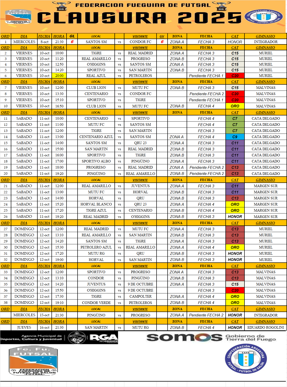 Programación a jugarse hasta el domingo 15 de octubre