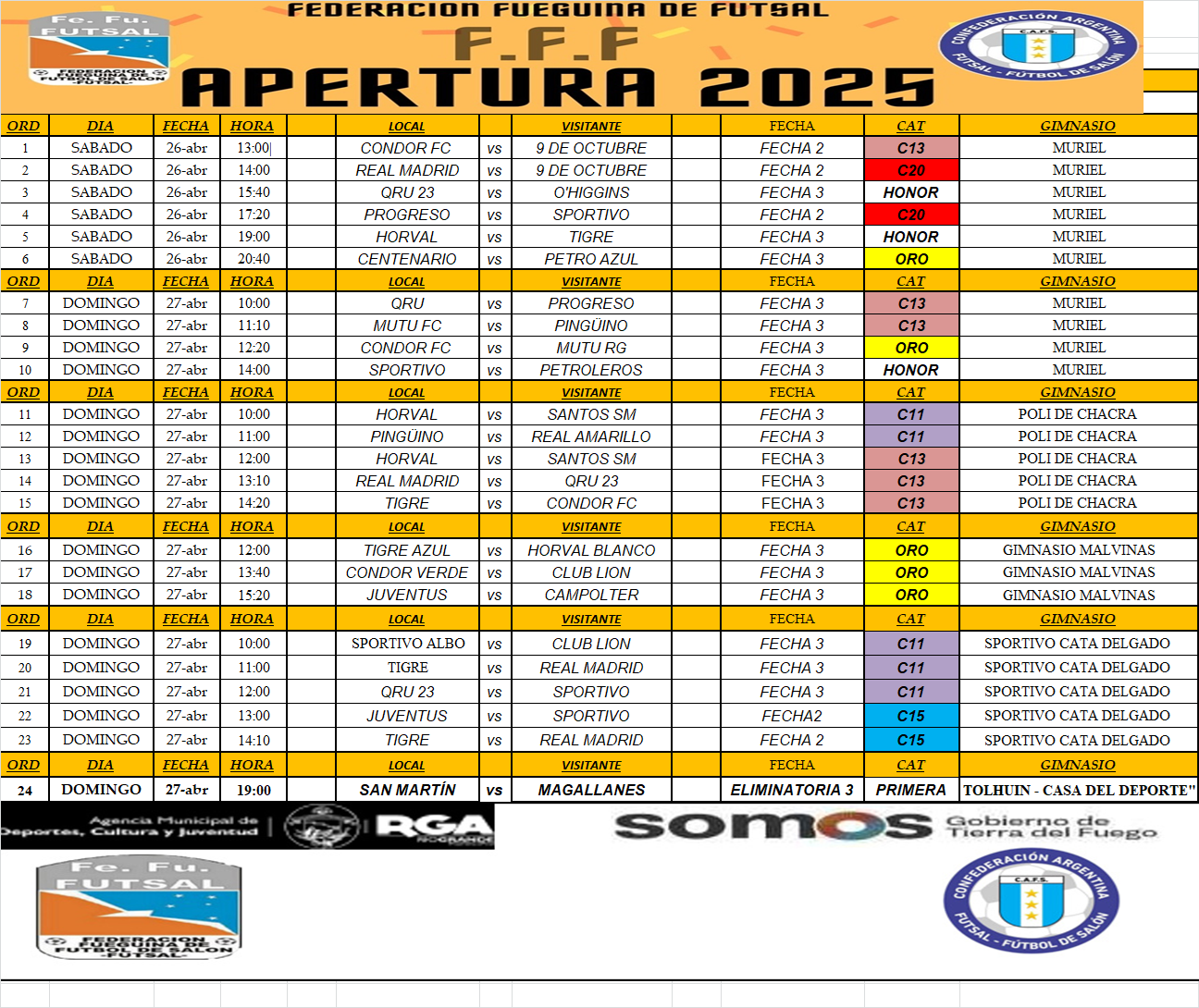 Se dió a conocer la programación de partidos para este fin de semana. El sábado se juega en el Muriel solamente. El domingo la programación irá hasta las 16 horas. El motivo, es por el tercer partido que definiran San Martín y Magallanes. Muchos pidieron no jugar para ir a ver la definición provincial desde las 19 horas en la casa del deporte de Tolhuin. Se suma también el superclásico.