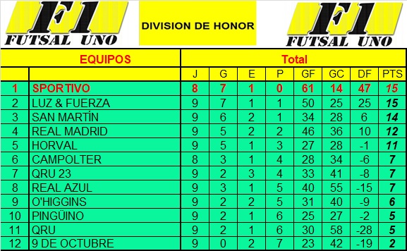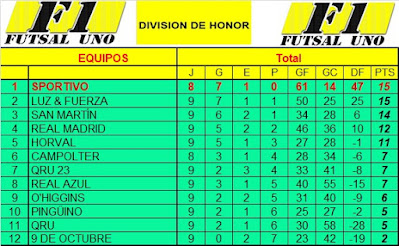 Al triunfo de Luz & Fuerza 6-4 ante Real Madrid del jueves, se les sumaron las victorias de San Martín 5-3 sobre 9 de Octubre y de Horval 2-1 ante Pingüino Futsal en la jornada del sábado 12. Ayer domingo en el gimnasio Integrador Qru superó 5-1 a O’Higgins y a última hora Real Azul 5-4 a Qru 23. El próximo miércoles 16, juegan desde las 21 horas en el polideportivo Malvinas, Sportivo y Campolter.