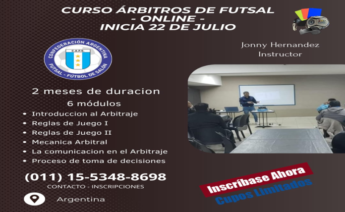El mismo tiene un total de 6 módulos. Introducción al arbitraje, reglas de juego 1, reglas de juego 2, mecánica arbitral, la comunicación en el arbitraje y proceso de toma de decisiones. El curso estará dictado por Jonny Hernández, instructor nacional de la Cafs y tiene una duración de 2 meses. Más información e inscripcion al whatsapp (011) 15-5348-8698 (Jonny Hernandez). Cupos limitados.